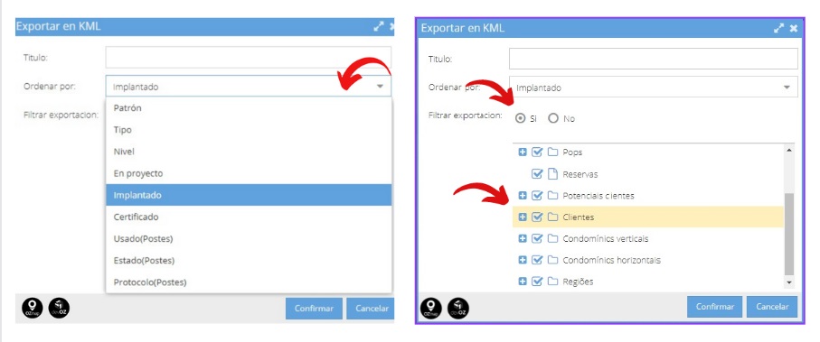 1. Exportar - El área determinada se puede exportar en forma de hoja de cálculo en formato KML, compatible con Google Earth. Para el formato KML, es posible exportar el proyecto completo, agrupar según el tipo, nivel, estado de implantación, etc., y filtrar por elemento. También se puede exportar en tablas XLS, compatibles con Excel, o CSV.