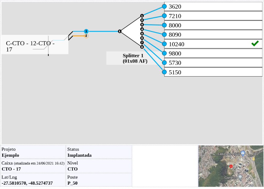 El sistema generará un archivo y lo descargará, en el archivo generado (abajo) se puede ver el esquema (dibujo) de la caja, el proyecto al que pertenece, el nombre de la caja, el poste en la que se encuentra, el estado (esté implantado o no), el nivel, las coordenadas y un mapa que muestra su posición en una vista aérea.
