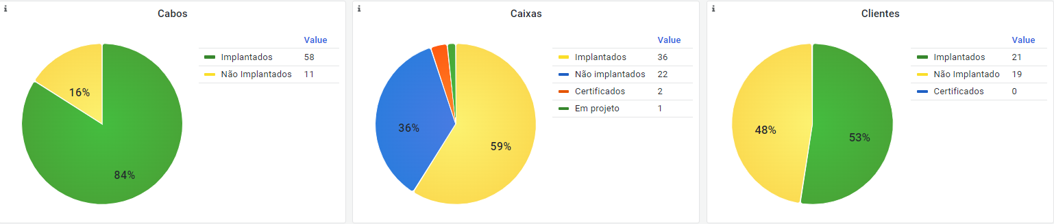 Los gráficos circulares muestran información sobre el despliegue de cables, cajas y clientes. Es importante señalar que los filtros de tiempo no se aplican a los gráficos circulares, la información que se muestre en ellos será siempre la más reciente, actualizada automáticamente por el sistema.