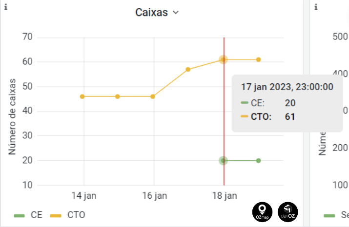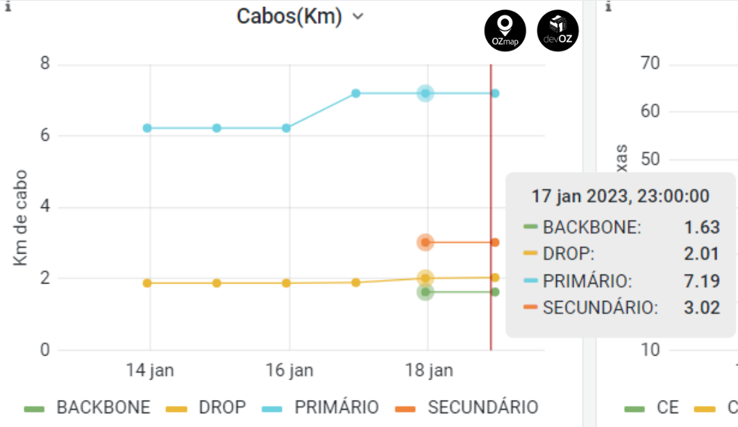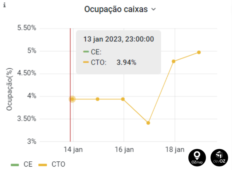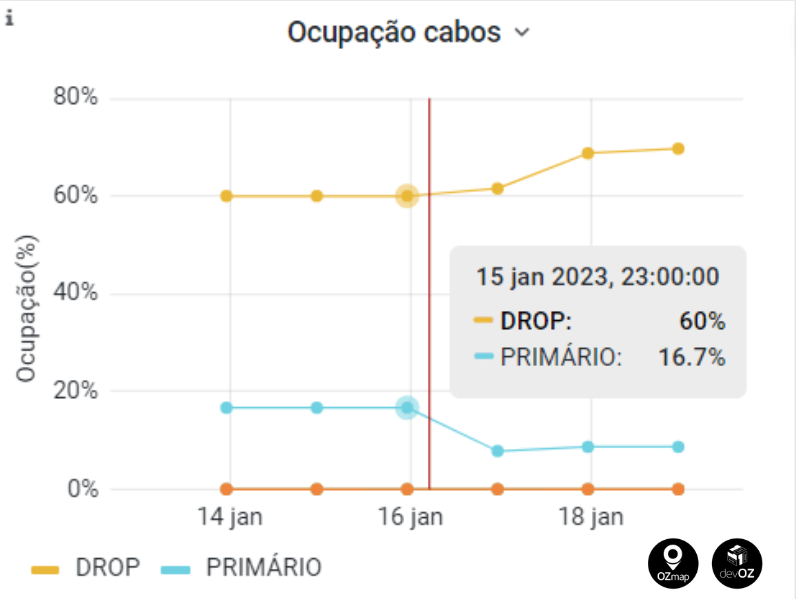 En los gráficos de líneas tenemos la cantidad en porcentaje de ocupación de cables y cajas según el nivel de los elementos. La ocupación de cables considera el porcentaje de fibras libres y fibras conectadas, mientras que la ocupación de cajas considera la cantidad de equipos dentro de la caja que permite la conexión al cliente.