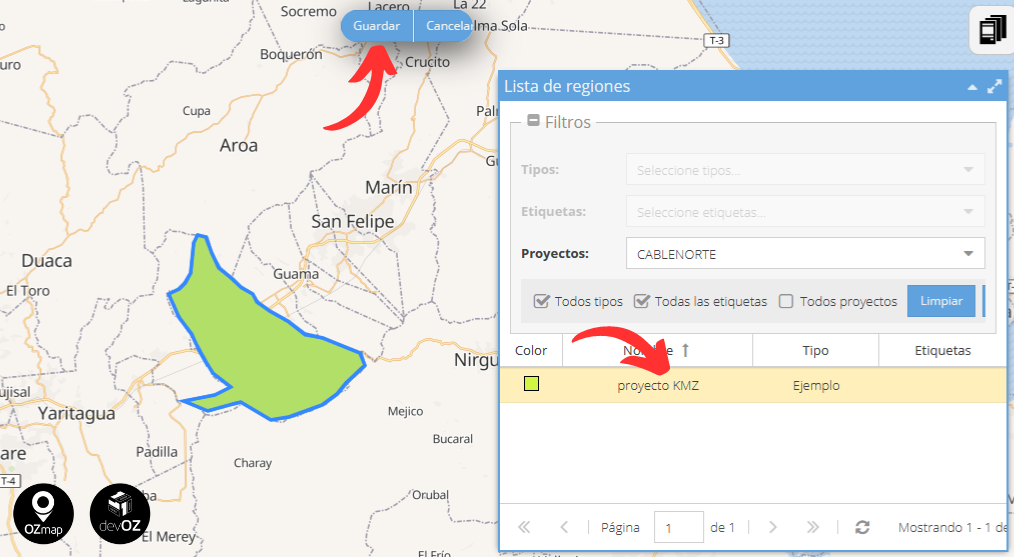 | Si tiene más de una región, simplemente elija la región deseada, haga clic en "Guardar" y confirme la edición del área del proyecto |