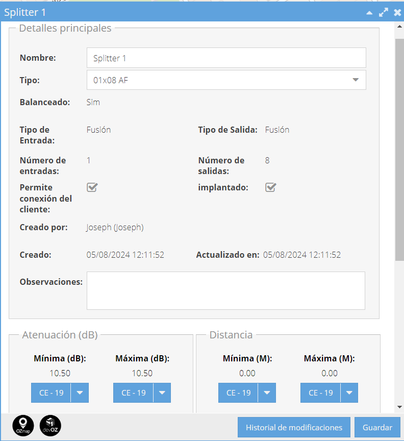 Para ver las propiedades de un splitter basta con hacer clic con el botón derecho del mouse y seleccionar la opción “Propiedades del elemento”. Al abrir las propiedades de su splitter, verá los detalles principales como el nombre, tipo, estado de implantación, etc. y también información sobre su atenuación. Puede editar algunas de estas informaciones. Descendiendo más abajo, encontramos información sobre los puertos del splitter, donde podemos configurarlas individualmente, agregando detalles sobre la potencia de los puertos, etiquetas, observaciones y bloqueando los puertos para evitar cualquier conexión. ![]() En el ejemplo siguiente, bloqueamos el puerto del splitter y, después del bloqueo, intentamos conectarnos al puerto para demostrar cómo funciona. En el puerto 2, añadimos una observación y, al pasar el mouse sobre ella, se muestra la observación. ![]() La función de bloqueo del puerto funciona bloqueando cualquier conexión con el puerto, ya sea con otros equipos o clientes. Además de estar bloqueado en el editor de caja, esto también impide que cualquier venta se realice en ese puerto a través de la búsqueda de viabilidad en OZloc. |