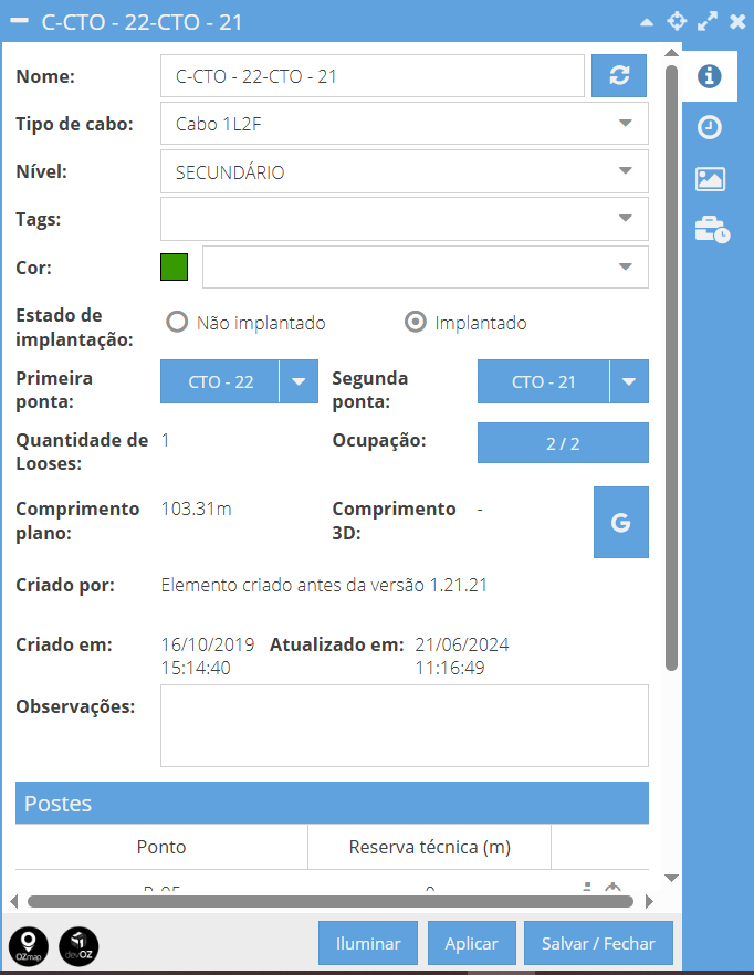 Os cabos são elementos fundamentais no OZmap, formados por um conjunto de looses (que, por sua vez, contêm fibras). Seu tipo é definido por características específicas (para detalhes sobre os tipos de cabos, clique aqui). Além do tipo, eles também possuem outros atributos como o nome, nível hierárquico, estado de implantação, cor, posts, entre outros.