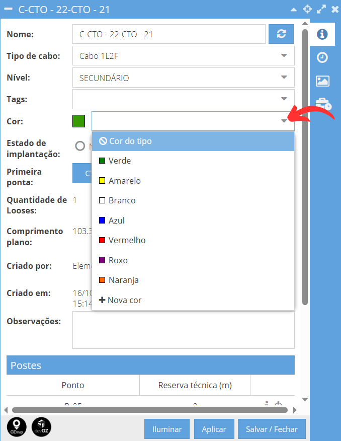 Por fim, basta preencher as especificidades do novo cabo e clicar em gerar para que ele seja registrado no mapa.