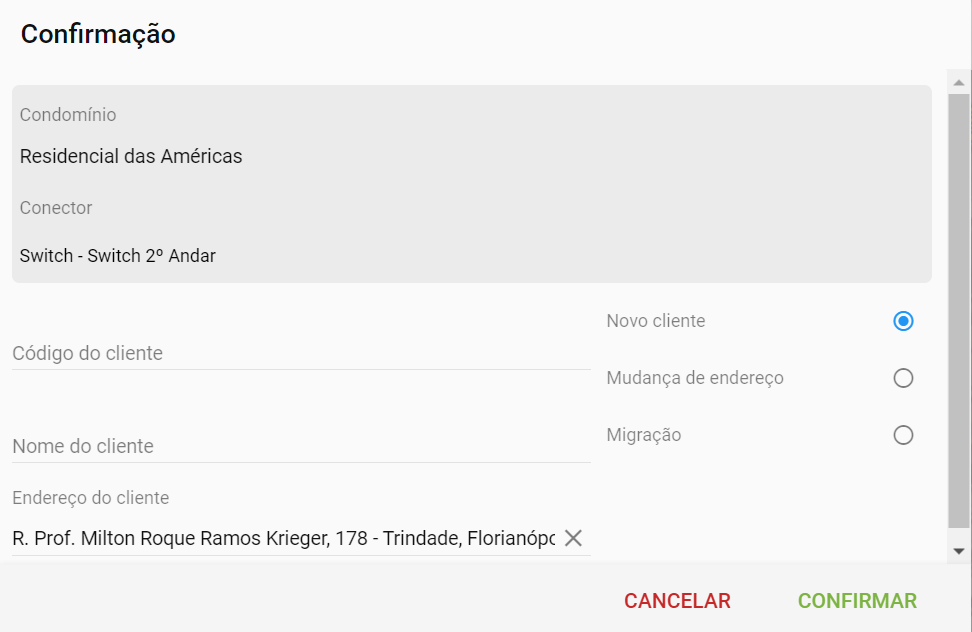 Logo após selecionar em qual equipamento/andar você deseja conectar o cliente, abrirá uma janela solicitando a confirmação, onde você colocará o código e nome do seu cliente.
