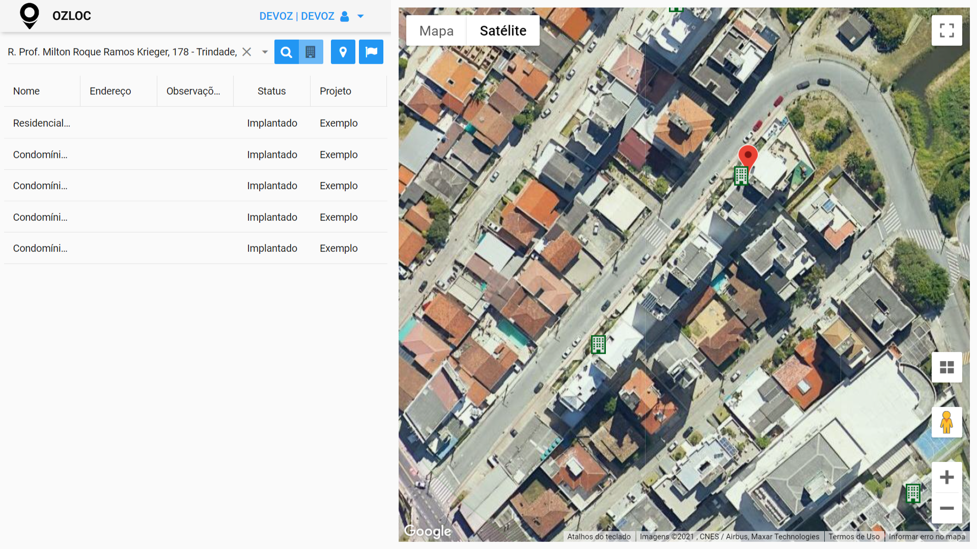 Com isso, o mapa será aproximado no seu endereço. Se houverem condomínios disponíveis, seus ícones aparecerão no mapa e também uma lista com seus nomes no lado esquerdo da tela.
