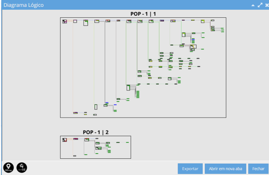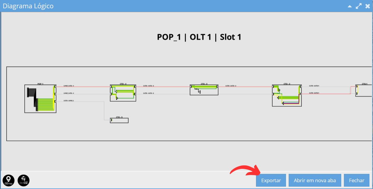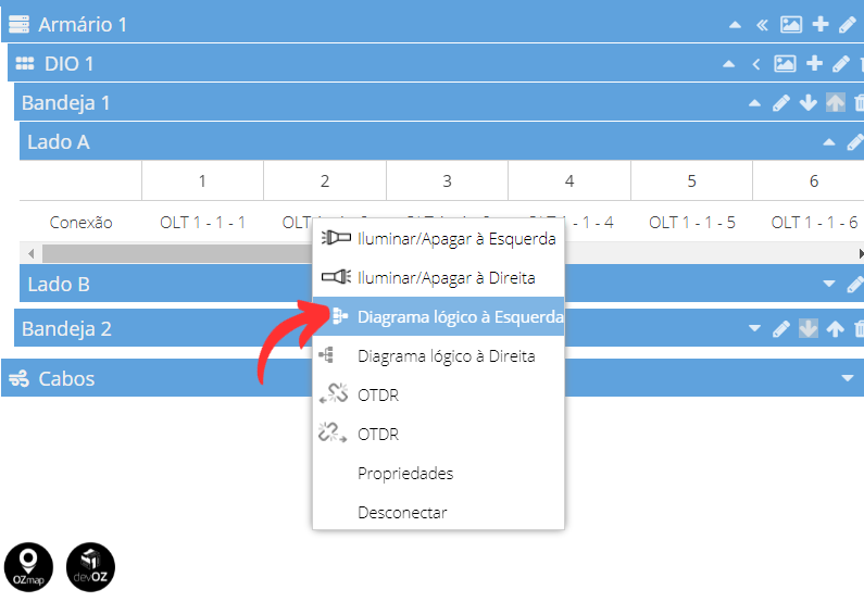 Na POP, o processo é semelhante ao da caixa. Você pode selecionar qualquer equipamento da POP para realizar o diagrama, lembrando que na OLT só é possível iluminar para a direita, pois ela é o elemento inicial do diagrama.