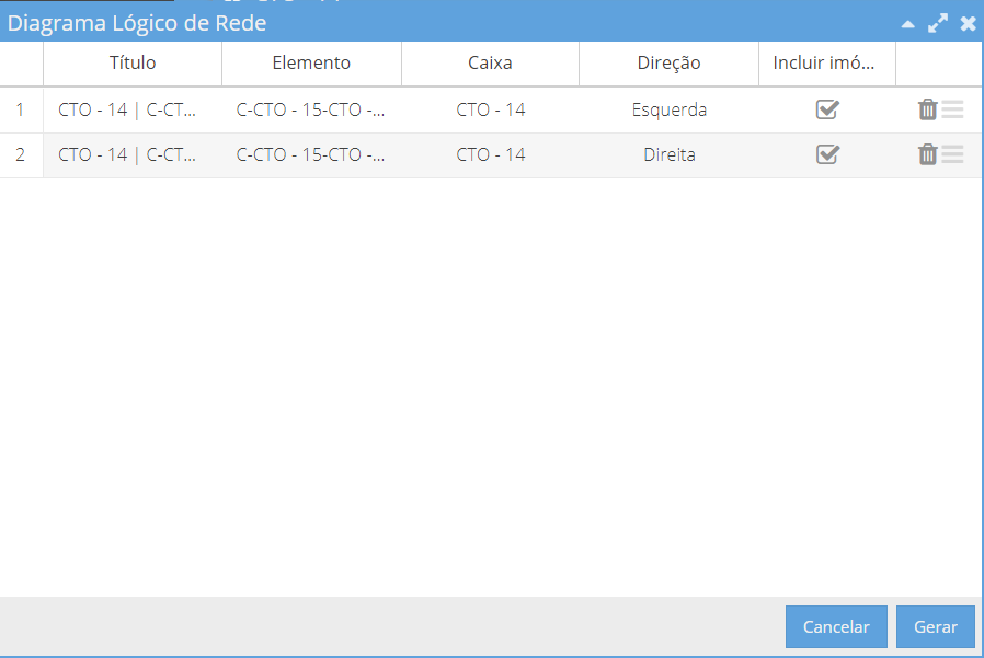 É possível selecionar mais de uma fibra ou OLT para gerar dentro do diagrama lógico. No caso das caixas, você pode criar o diagrama lógico de várias fibras e em diferentes direções (esquerda e direita). Além disso, você pode reorganizar os elementos clicando no botão com três linhas, excluir um elemento usando o botão da lixeira e escolher se os imóveis que estão ao longo do caminho aparecerão no diagrama.