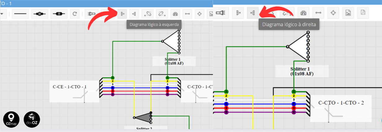 Para gerar um diagrama lógico nas caixas, basta clicar nos botões destacados pela imagem abaixo, escolhendo gerar o diagrama para a esquerda ou para a direita.