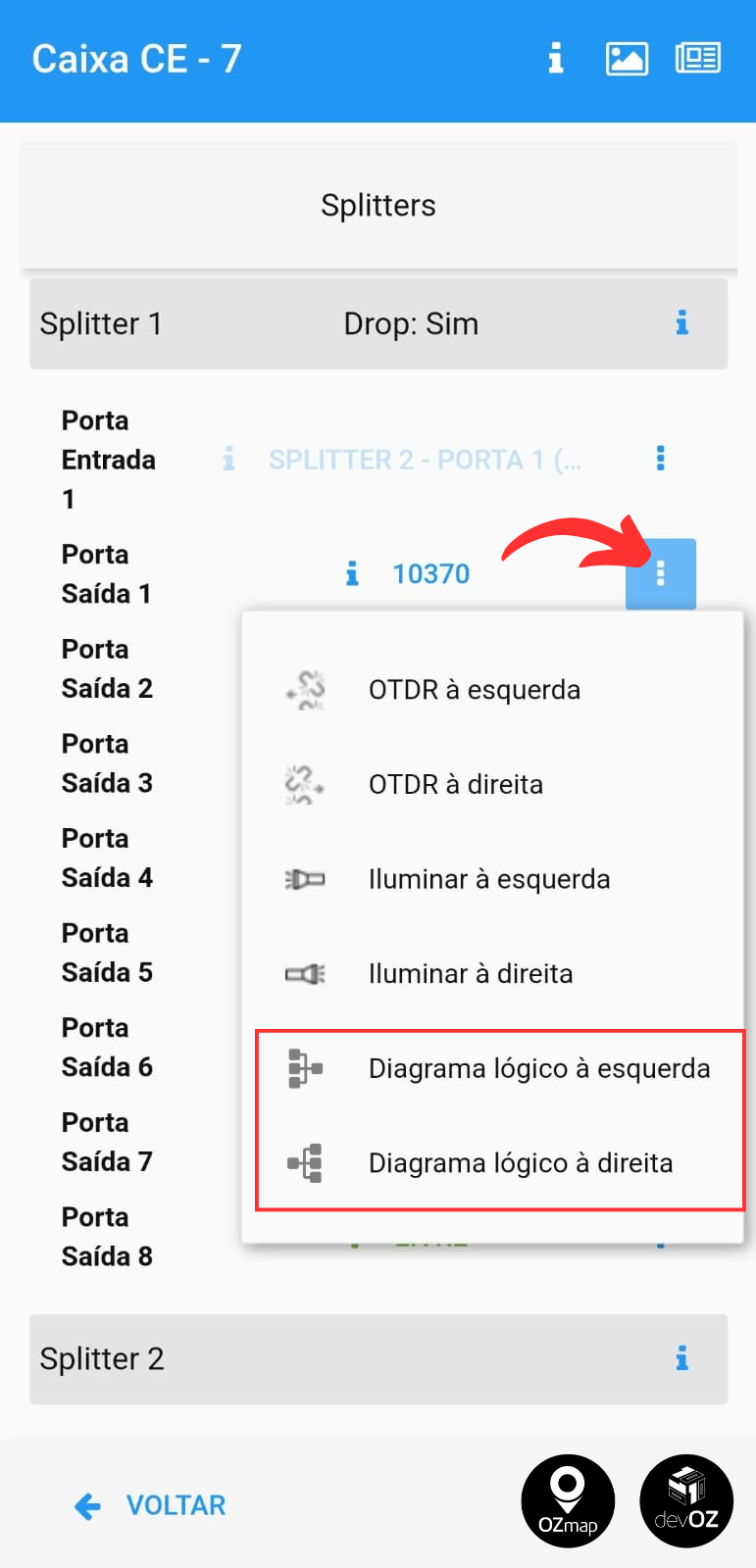 O diagrama lógico também pode ser utilizado no OZmob, da mesma forma que no OZmap. Basta clicar no ícone de três pontos ao lado do nome da fibra desejada e selecionar a direção do diagrama.